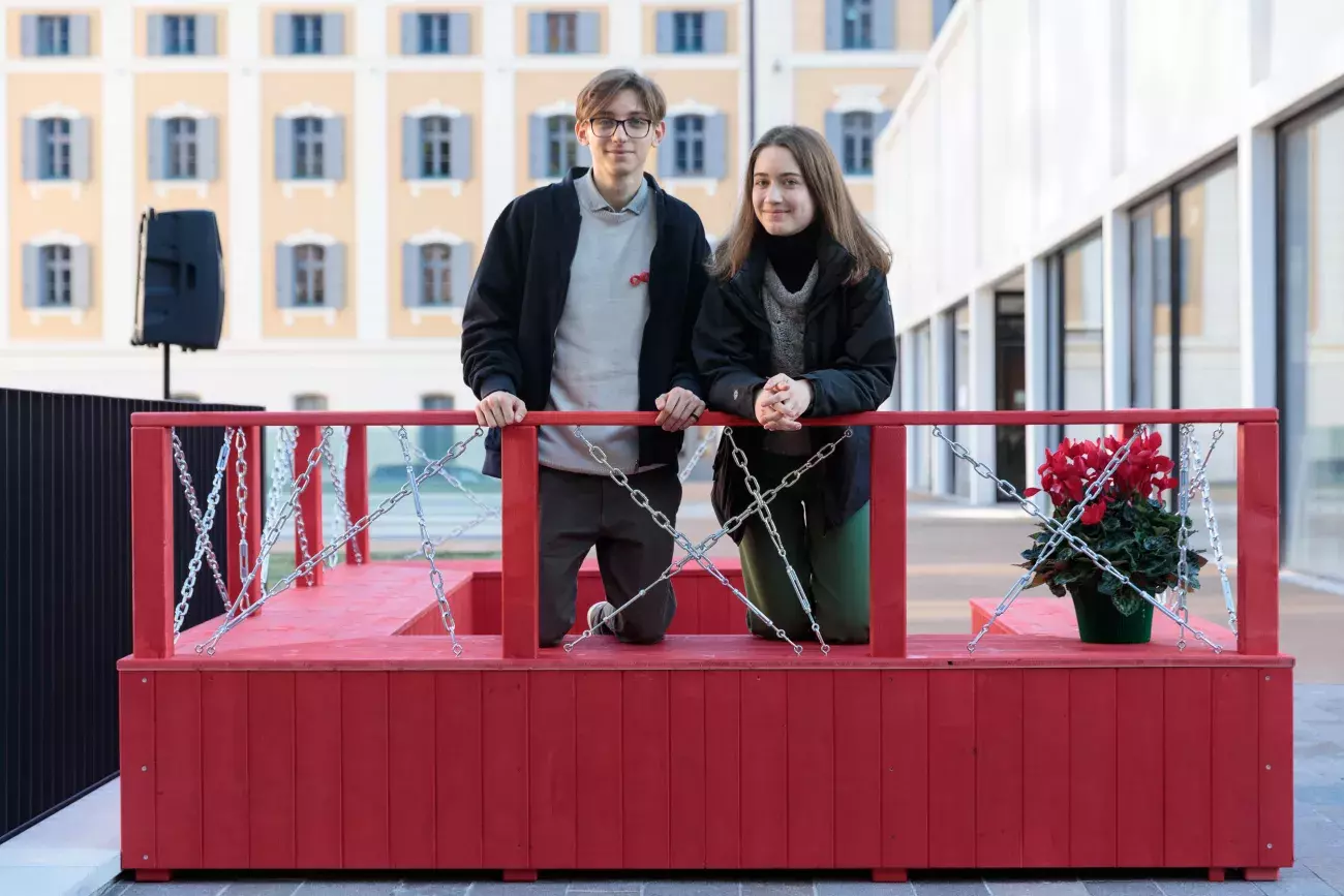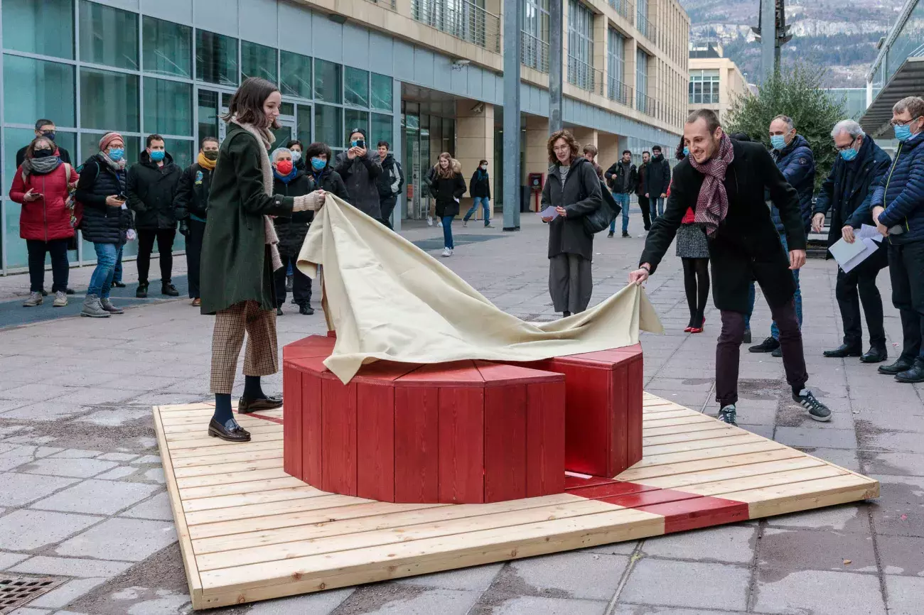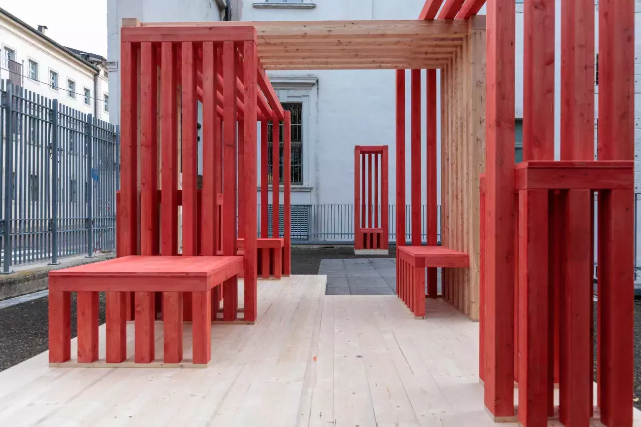 The project primarily involves students from the departments and centres of the STEM (science, technology, engineering and mathematics) area, who are invited to design and create red wooden benches.